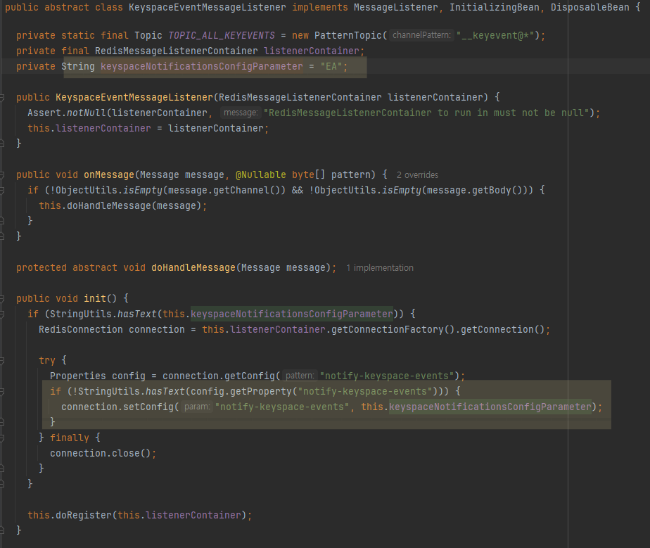 Redis의 키 만료 이벤트를 받을 수 있는 이유는 KeyExpirationEventMessageListener가 KeyspaceEventMessageListener를 상속하고 있기 때문입니다. KeyspaceEventMessageListener를 살펴보면, Redis 설정에서 notify-keyspace-events 옵션에 Ex 값을 설정하여 이벤트를 활성화하도록 구성되어 있습니다.