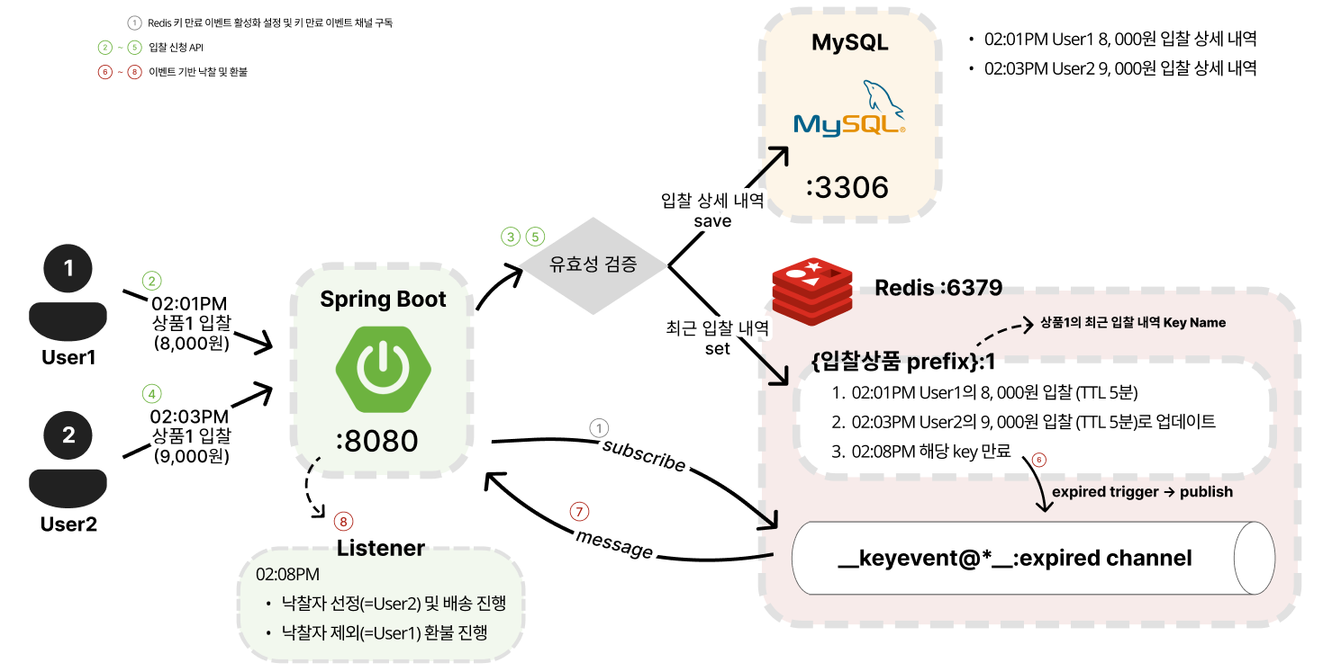결론부터 이야기하자면, Redis의 Keyspace Notification 기능을 활용해 입찰 데이터의 실시간 처리와 자동 낙찰 로직을 구현했습니다.