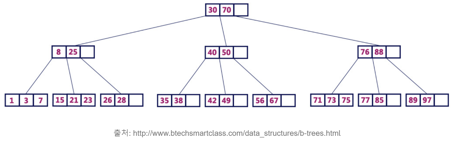 - 트리의 높이가 낮아 검색 시 디스크 접근이 줄어들고, 검색 속도가 향상됨.