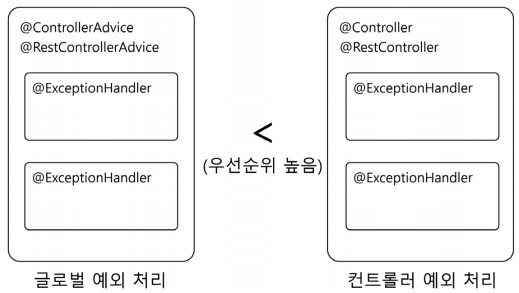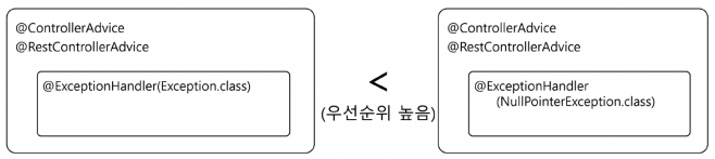컨트롤러에서 던진 예외는 @RestConrollerAdvice와 @ConrollerAdvice가 선언되어 있는 핸들러 클래스에서 매핑된 예외 타입을 찾아 처리하게 된다.
