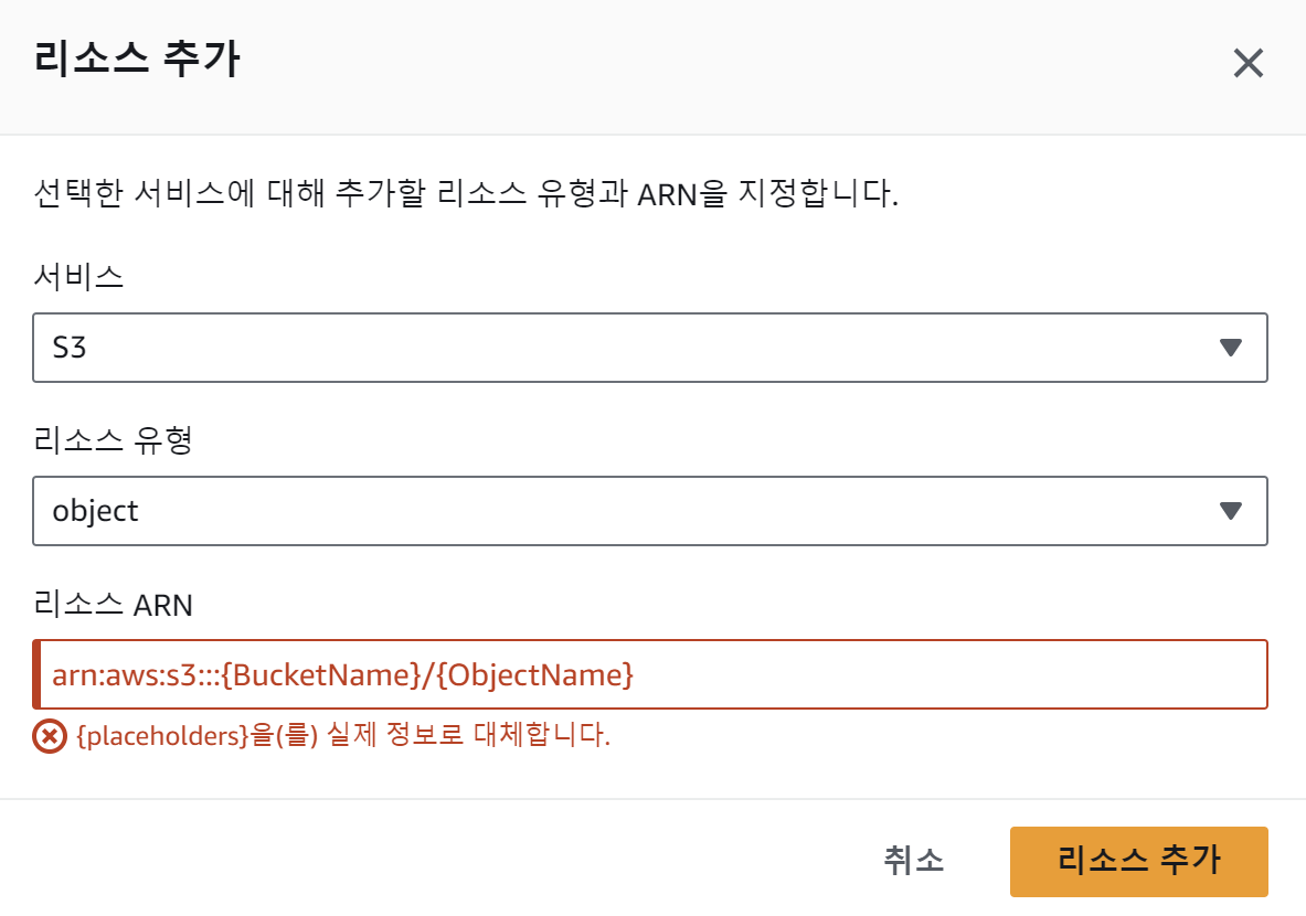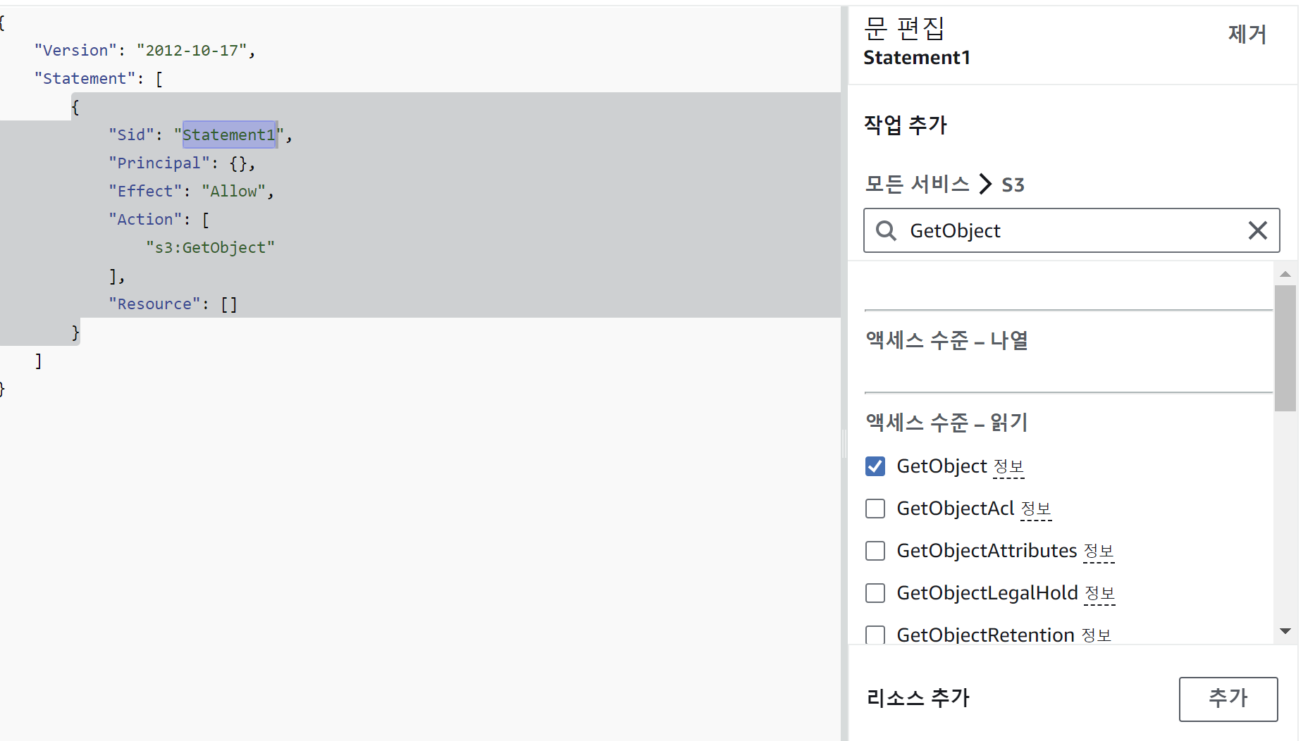 S3 검색 -> S3 선택 -> getObject 검색 -> getObject 선택 -> 리소스 추가