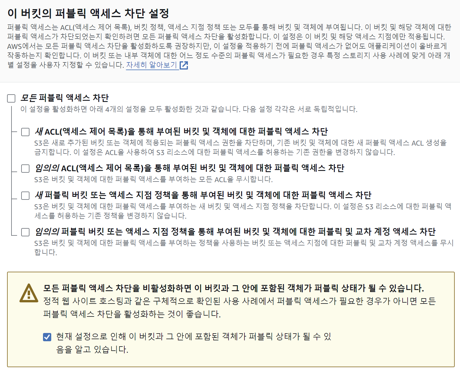 해당 설정은 S3 객체에 공개적으로 접근(public access)이 가능하도록 만들어 준다.