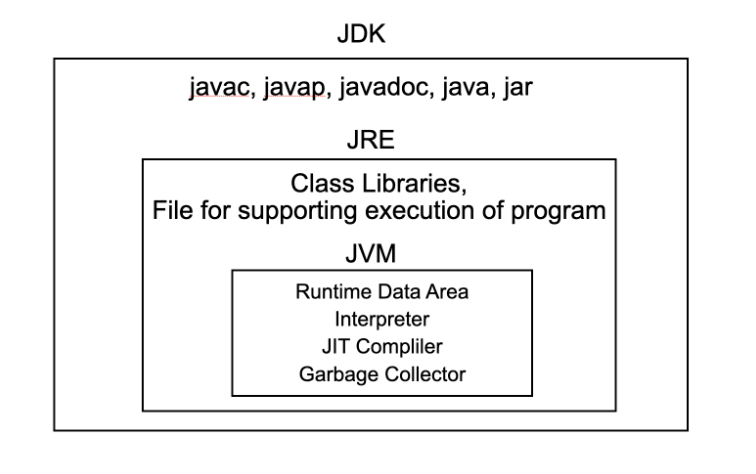 - JRE는 자바 실행 환경으로 JVM,자바 클래스 라이브러리, 기타 자바 어플리케이션 실행에 필요한 파일들을 포함